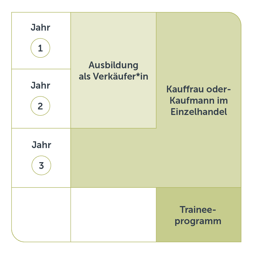 Mach's dir passend: Bei uns kannst du dich für eine Ausbildung als Verkäufer*in oder als Kauffrau/Kaufmann im Einzelhandel (m/w/d) entscheiden. In den ersten beiden Jahren sind die Inhalte der beiden Ausbildungen gleich. Du hast Lust, noch mehr Verantwortung zu übernehmen? Nach Abschluss deiner Ausbildung, hast du die Möglichkeit, an unserem Traineeprogramm teilzunehmen. Hier lernst du die verschiedenen Häuser und die Verwaltung noch besser kennen und kannst in eine Führungsrolle hineinwachsen.