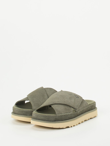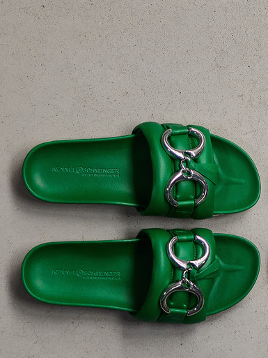 Ob Olive, Khaki oder sattes Grasgrün: Die aktuellen Grüntöne sind so wandelbar wie modisch. Reduzierte Slides mit Bastsohle, Pantoletten mit Schnallen, Metallic-Details oder markanten Sohlen - jede Variante bringt Frische in Ihre Garderobe. Wählen Sie Ihre Lieblingsnuance und setzen Sie ein individuelles Sommer-Statement.