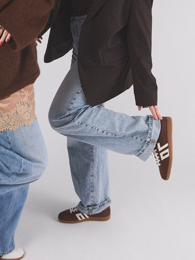 Casual: Kombinieren Sie braune Sneaker mit Jeans, Oversize-Pullover und Trenchcoat für einen modernen, entspannten Look.