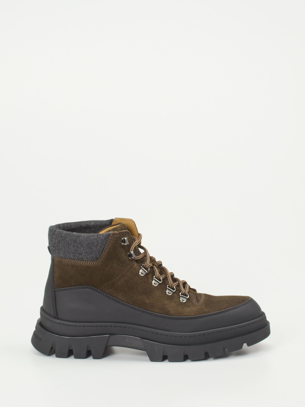 Mit robustem Veloursleder, zweifarbiger Schnürung und filzgepolstertem Einstieg verbinden diese Wanderboots Funktionalität und stilvolle Outdoor-Ästhetik.