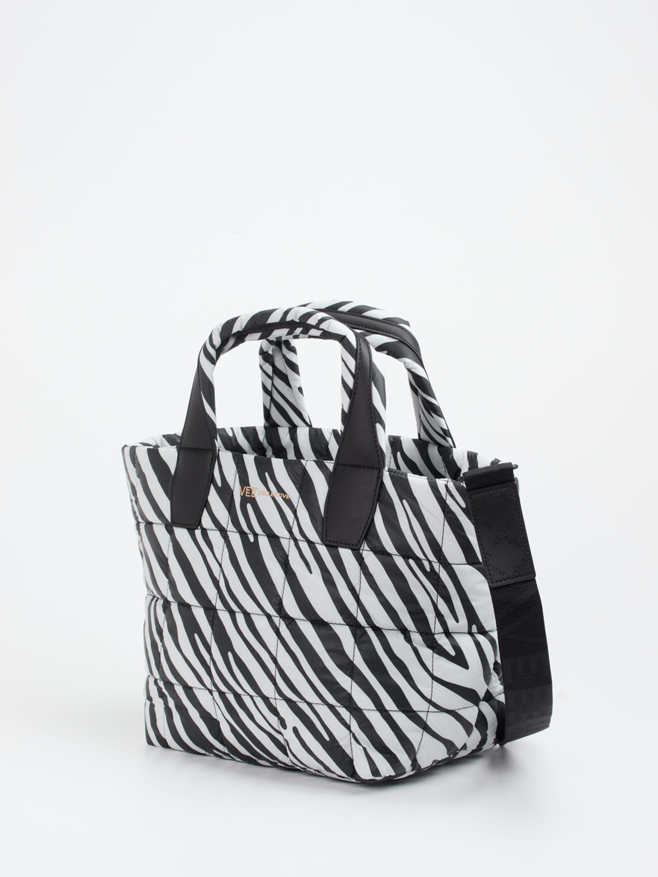 Die gesteppte Tote Bag von VeeCollective Berlin vereint pufferartiges Design mit edgy Zebramuster. Funktional, urban und modisch – ein stilvoller Begleiter für Alltag und Business.