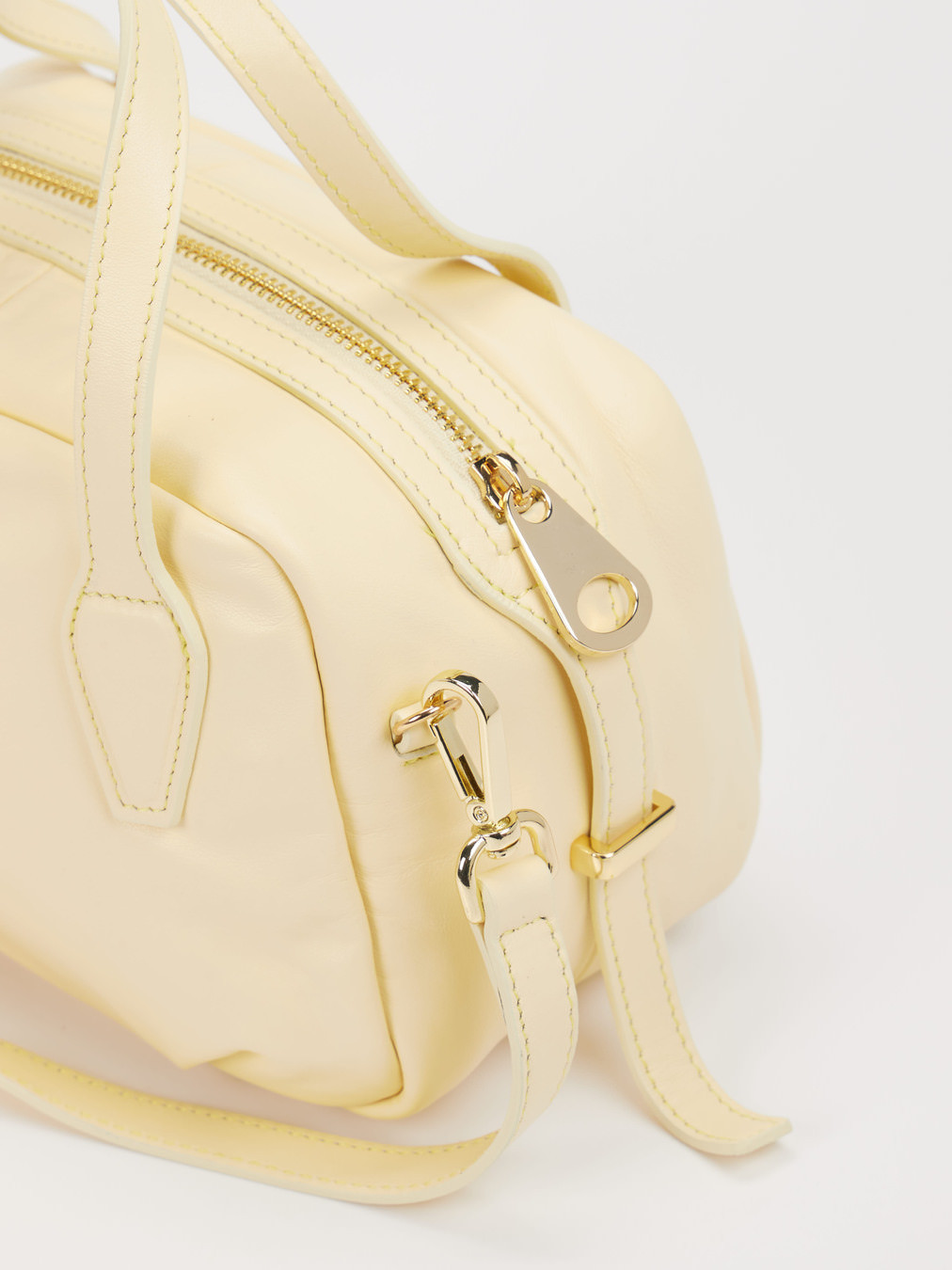 Die Mini Bowling Bag von Konstantin Starke setzt auf eine kompakte Silhouette, soft wirkende Linien und goldfarbene Hardware. Dank abnehmbarem, verstellbarem Riemen passt sie vom City-Trip bis zum gepflegten Büro-Look.