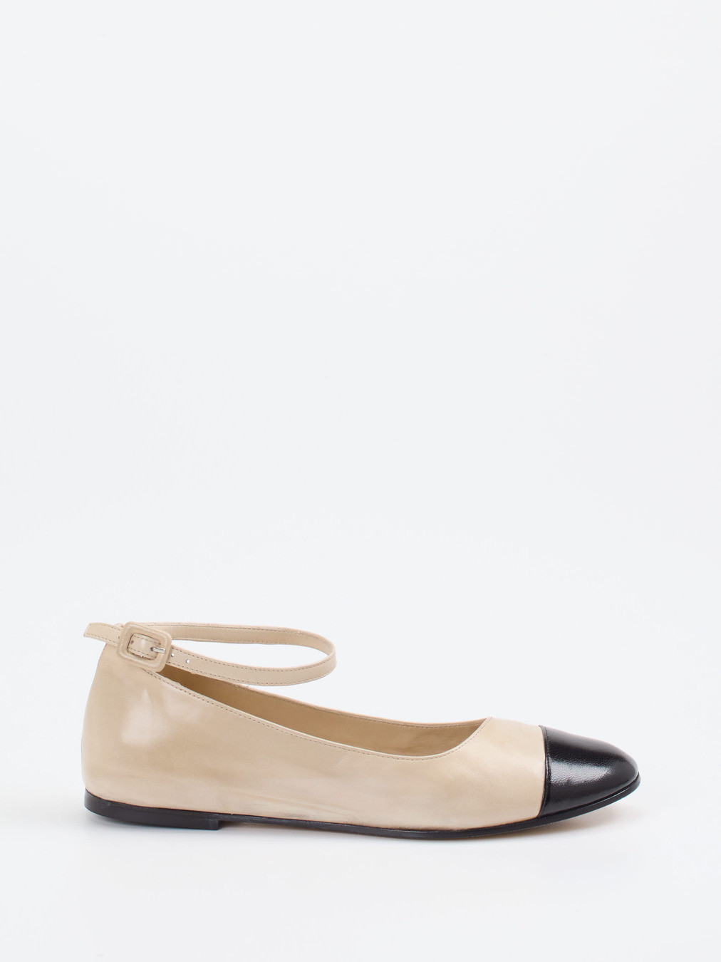 Diese zweifarbigen Ballerinas verbinden weiches Lammleder mit minimalistischem Chic. Das Riemchendesign sorgt für sicheren Halt und ästhetisches Gleichgewicht.