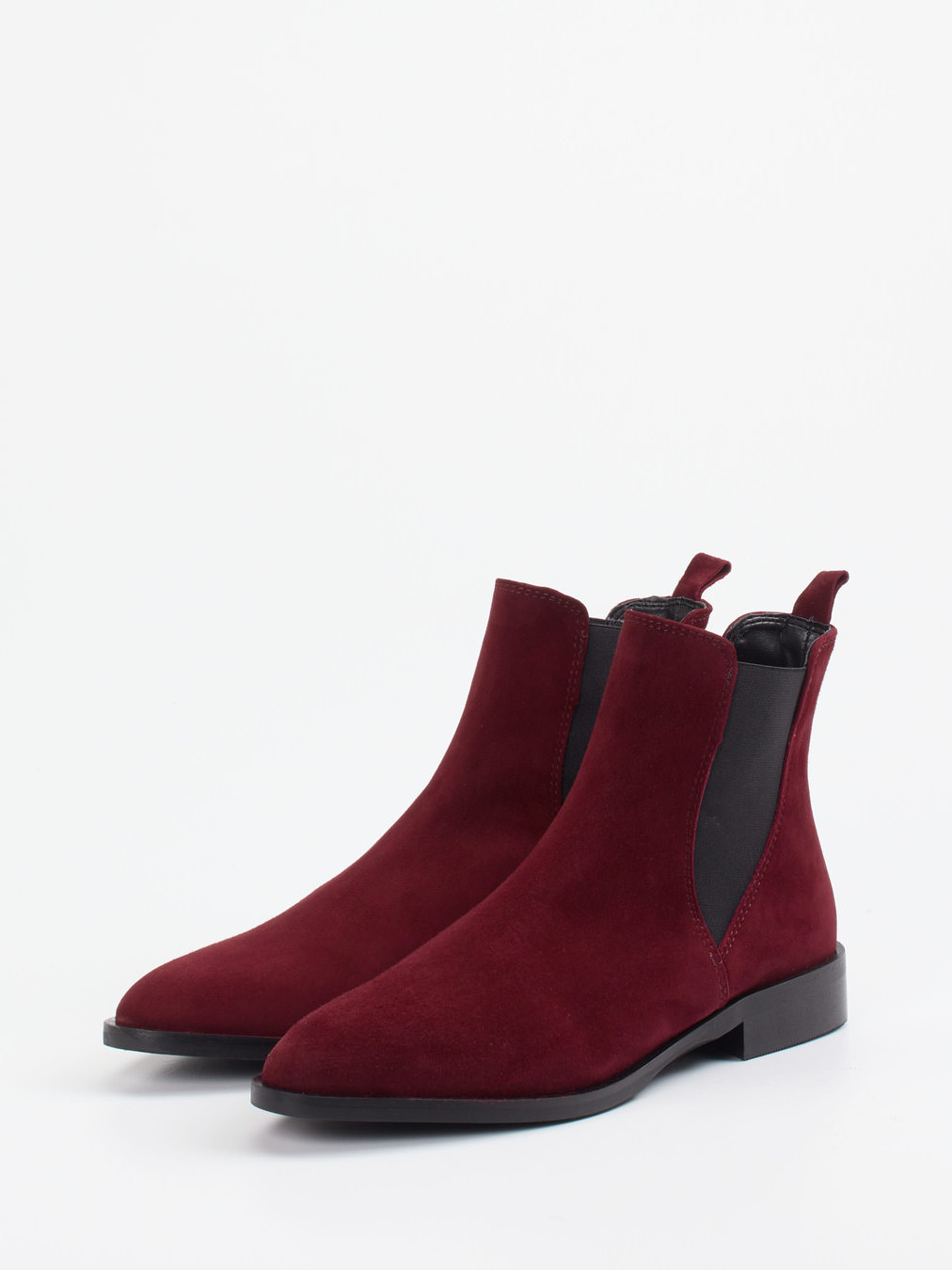 Der knöchelhohe Chelsea Boot vereint weinrotes Veloursleder mit einem puristischen Schnitt – raffiniert minimalistisch mit femininer Linienführung.