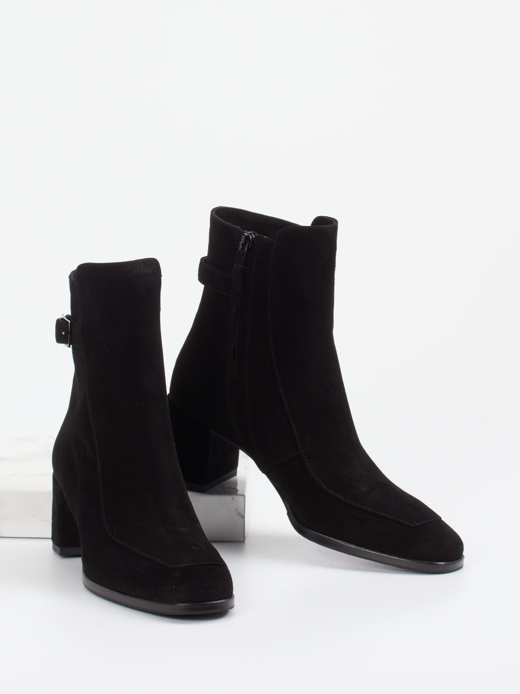 Diese Stiefelette kombiniert samtig mattes Veloursleder mit minimalistischer Eleganz. Die dekorative Schnalle setzt ein stilvolles Detail, das dem Modell zeitlose Raffinesse verleiht.