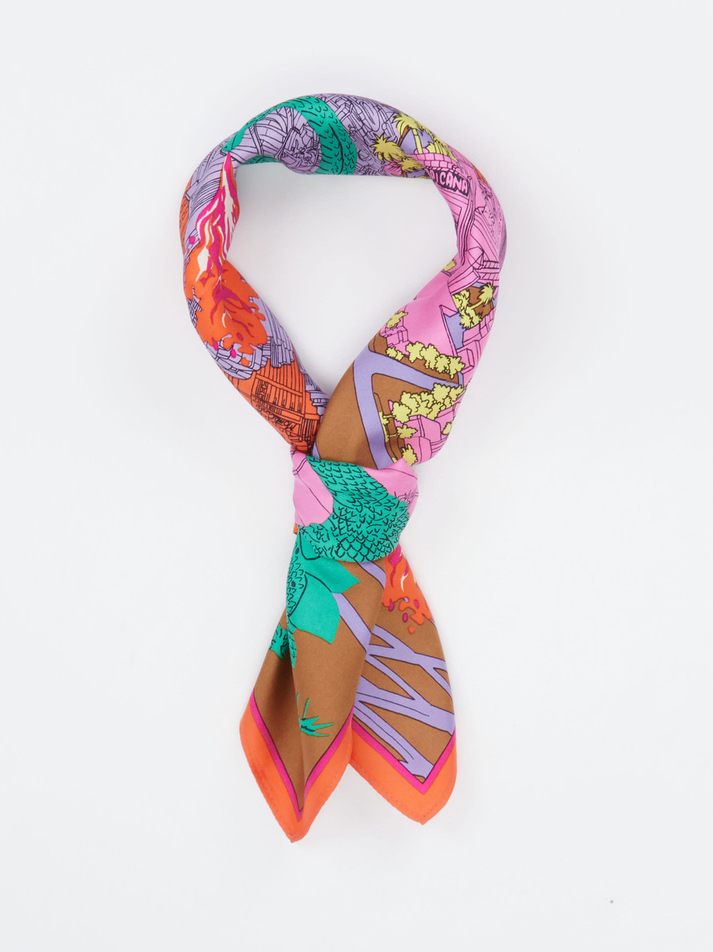 Das quadratische Tuch aus reiner Seide kombiniert Pop-Art-Ästhetik mit einem humorvollen Las-Vegas-Motiv – ein ausdrucksstarkes Accessoire für trendorientierte Looks.