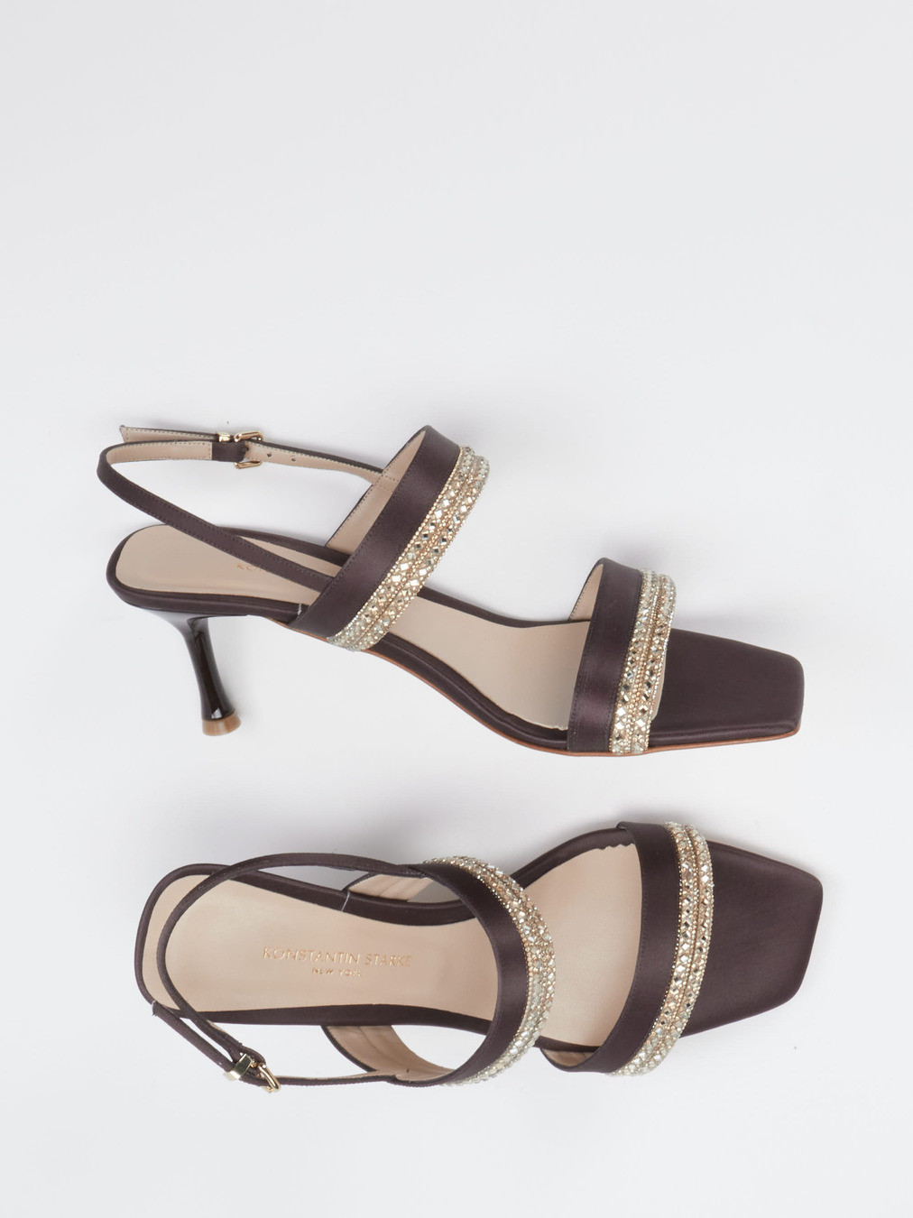 Elegante Slingback-Sandalette mit schlankem 5,5-cm-Absatz und eckiger Zehenform. Strasskanten an den breiten Riemen und eine goldfarbene Schnalle setzen einen präzisen, festlichen Akzent.