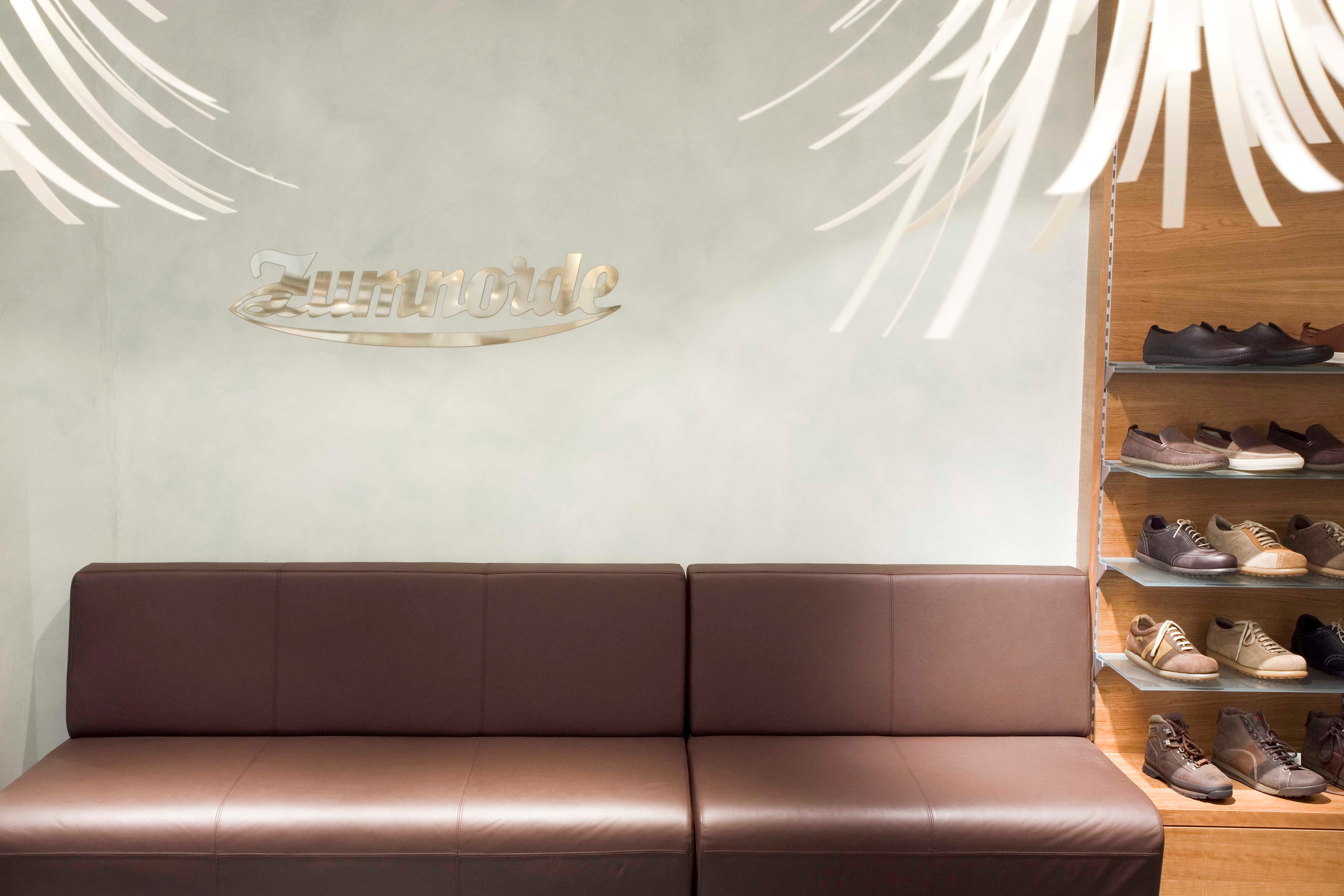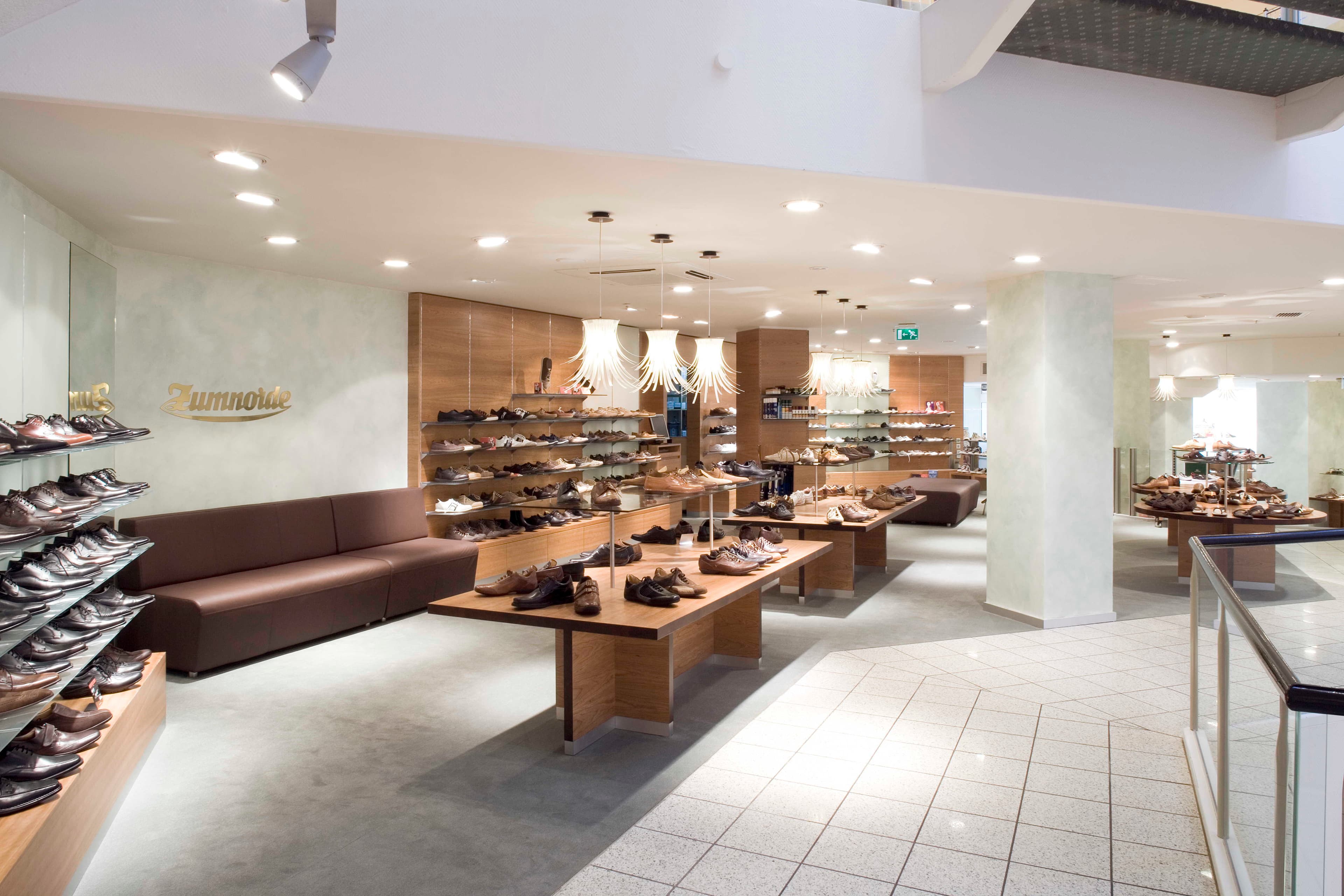 Eine zündende Idee. Zumnorde-Schuhe im Modehaus Kressmann auf zwei Ebenen – angebunden an die jeweiligen Textilabteilungen – zeigt Zumnorde modisch gute Schuhe für die ganze Familie. Hochwertiges Ambiente mit Kirschbaum-Furnier und echten Lederbezügen unterstreicht die Wertigkeit unseres Schuhangebotes. Spanische Designerleuchten setzen besondere Akzente.