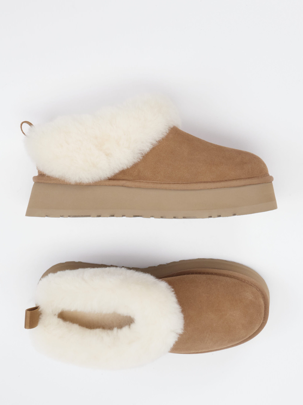 Kuscheliges Lammfell, kombiniert mit robustem Veloursleder und einer rutschfesten Plateau-Sohle – dieser UGG-Hausschuh bringt Komfort und Stil in Balance.